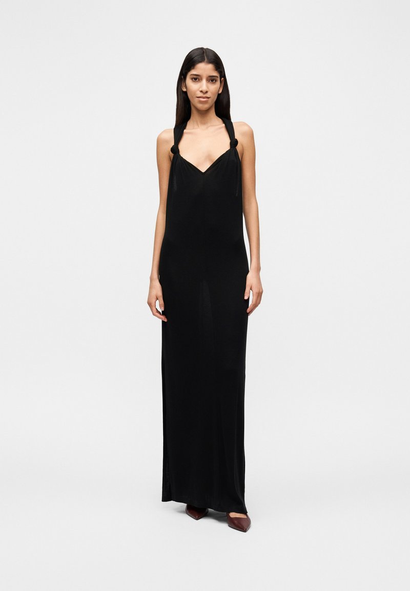 Μαύρο μακρύ φόρεμα με λαιμόκοψη halter από απαλό ύφασμα, με βαθύ V ντεκολτέ, λεπτομέρειες κόμπων στους ιμάντες και πλαϊνές σκισμές για ευκολία στην κίνηση.