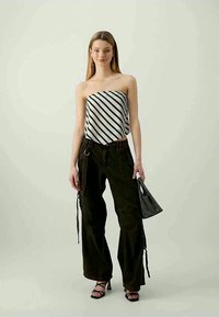 Ανατρεπτή τοπ χωρίς τιράντες από λευκό ύφασμα με ναυτικές διαγώνιες ρίγες, με στρογγυλή άκρη. Συνδυάζεται με σκούρες πράσινες cargo παντελόνες και κρίκους στα αυτιά.