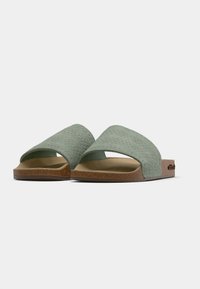 Παντόφλα τύπου σλάιντ με επάνω μέρος σε μέντα πράσινο με υφή και ταμπά πάτο. Ο σχεδιασμός διαθέτει σολάκι από φελλό και μινιμαλιστική σιλουέτα.