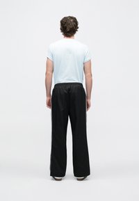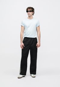 Μαύρο, πλισέ παντελόνι με φαρδιά μπατζάκια, ελαστική μέση και πλαϊνές τσέπες, υφή υφάσματος, συνδυασμένο με λευκά αθλητικά παπούτσια.