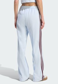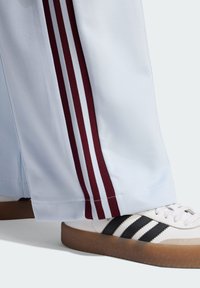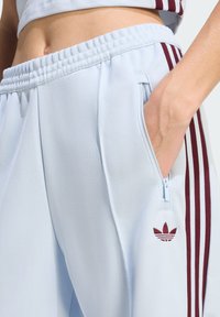 Φαρδιά ανοιχτά μπλε παντελόνια με μπορντό ρίγες στα πλάγια και τσέπες με φερμουάρ, κατασκευασμένα από ομαλό ύφασμα, με λογότυπο Adidas στο ύψος του γοφού.