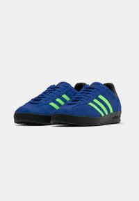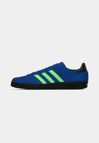 Μπλε αθλητικό παπούτσι Adidas Gazelle με νεον πράσινες ρίγες, μαύρη σόλα και μαύρο ταμπελάκι στη φτέρνα, σε ουδέτερο φόντο.