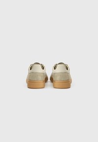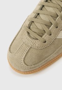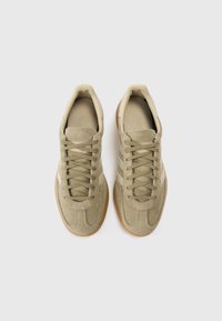 Αθλητικά παπούτσια από σουέντ σε ανοιχτό ελαιδί χρώμα με κρεμ τριπλή ρίγα, χρυσή σήμανση και σόλα από καουτσούκ καραμέλα, με χαμηλό προφίλ και σχέδιο με κορδόνια.