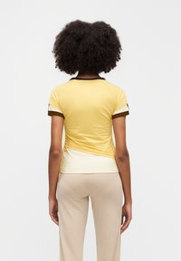 Κίτρινη αθλητική κοντομάνικη μπλούζα με καφέ λεπτομέρειες και μικρό λογότυπο. Σχεδιασμένη με στρογγυλή λαιμόκοψη και εφαρμοστή γραμμή.