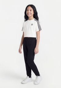 Μια χαμογελαστή κοπέλα στέκεται φορώντας λευκό κοντό τοπ της Adidas με μαύρες ρίγες, μαύρο παντελόνι jogger και λευκά αθλητικά παπούτσια σε απλό λευκό φόντο.