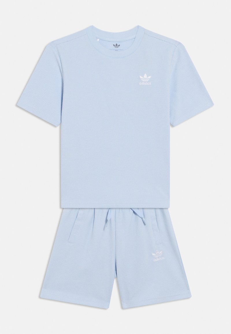 Σετ πουκάμισο με κοντά μανίκια και σορτς σε ανοιχτό μπλε χρώμα με υφασμένο μοτίβο. Διαθέτει στρογγυλή λαιμόκοψη και ζώνη μέσης με κορδόνι, με λογότυπο εμπορικού σήματος και στα δύο.