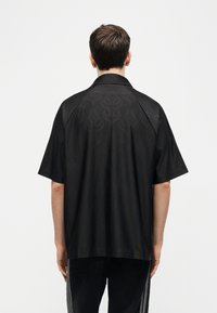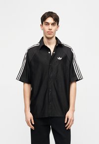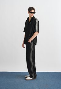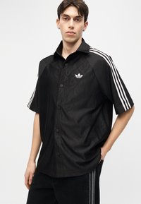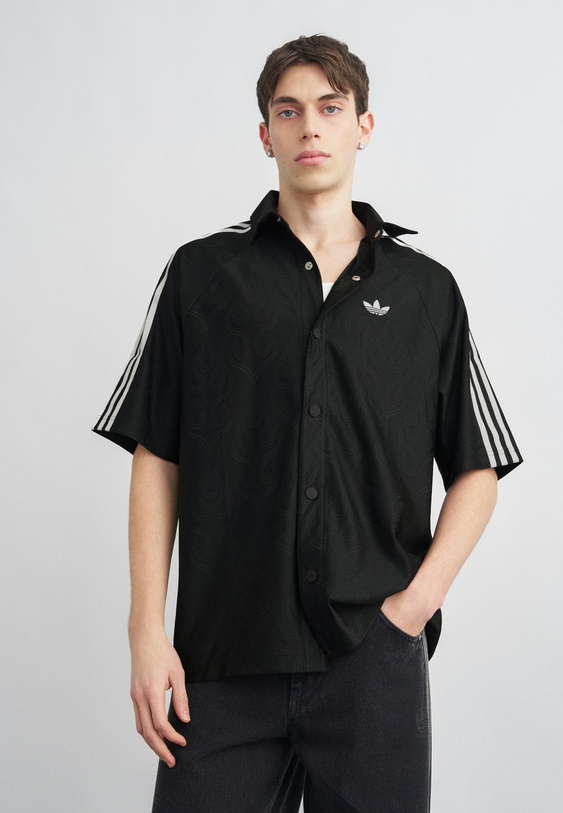 Νέος άνδρας που φοράει ένα μαύρο κοντομάνικο πουκάμισο Adidas με λευκές ρίγες στα μανίκια και λογότυπο στο στήθος, με το χέρι στην τσέπη.