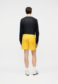 Άτομο που φοράει κίτρινα αθλητικά σορτς, λευκές κάλτσες και λευκά αθλητικά παπούτσια με μαύρες ρίγες, στέκεται μπροστά σε ένα απλό φόντο.