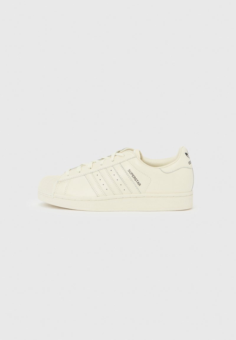 Αθλητικά παπούτσια από δέρμα σε κρεμ απόχρωση με υφή στην περιοχή των δαχτύλων, που διαθέτουν τρεις πλευρικές ρίγες, τρύπες και τη λέξη "SUPERSTAR" στην εξωτερική πλευρά.