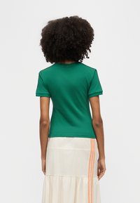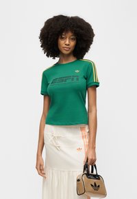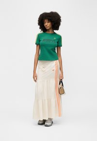 Γυναίκα με σγουρά μαλλιά που φοράει πράσινο t-shirt της ESPN, μακριά κρεμ φούστα με πορτοκαλί ρίγες, γκρι αθλητικά παπούτσια και κρατά μια μικρή μπεζ τσάντα χειρός.