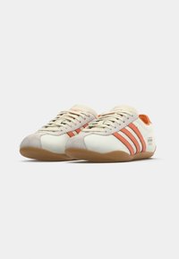 Λευκό και πορτοκαλί αθλητικό παπούτσι με τρεις πλάγιες ρίγες, άνω μέρος από λείο δέρμα, υφασμένο πέλμα και στρογγυλεμένη μύτη. Διαθέτει το λογότυπο "adidas TOKYO".