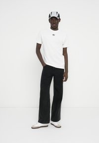 Λευκό βαμβακερό μπλουζάκι με κοντά μανίκια και στρογγυλή λαιμόκοψη, με μικρό μαύρο λογότυπο Adidas στο στήθος. Φορεμένο με μαύρο παντελόνι.