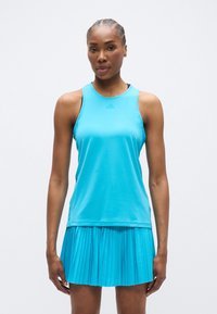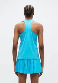 Ένα τυρκουάζ αθλητικό τοπ χωρίς μανίκια σε συνδυασμό με μια πλισέ φούστα, κατασκευασμένα από ελαφρύ ύφασμα, με στρογγυλή λαιμόκοψη και διακριτικό branding.