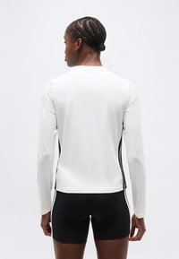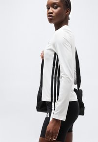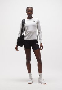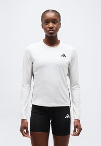 Γυναίκα που φοράει λευκό αθλητικό μπλουζάκι μακρυμάνικο και μαύρο σορτς, και τα δύο με το λογότυπο της Adidas, στέκεται μπροστά σε έναν απλό φωτεινό φόντο.