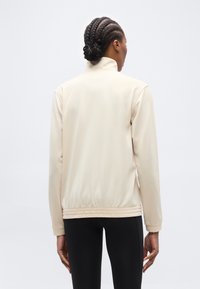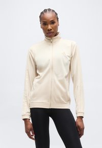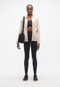 Γυναίκα με πλεξούδες, που φοράει μπεζ ζακέτα με φερμουάρ και μαύρο κολάν, στέκεται μπροστά σε απλό ανοιχτόχρωμο φόντο.