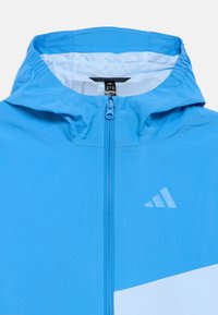 Μπλε αδιάβροχο μπουφάν με ανοιχτό μπλε πάνελ, διαθέτει κουκούλα, κλείσιμο με φερμουάρ και ελαστικές μανσέτες. Λογότυπο Adidas σε ανοιχτό μπλε στο στήθος.