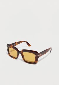 Ορθογώνια γυαλιά ηλίου με χελώνα πλαίσιο, φακοί με κίτρινη απόχρωση και διακριτικό χαραγμένο λογότυπο "Tom Ford" στη γωνία του φακού.