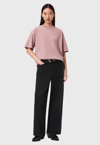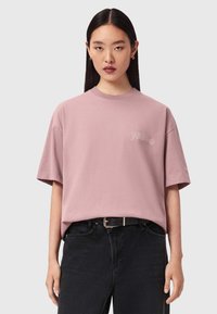 Γυναίκα με μακριά σκούρα μαλλιά που φοράει μια φαρδιά ροζ-σκουριάς μπλούζα με το κείμενο «AllSaints Enjoying the journey since '94» στην πλάτη.