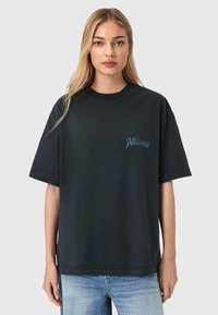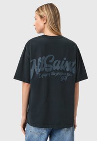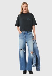 Νεαρή γυναίκα με μακριά ξανθά μαλλιά, φοράει μαύρο φαρδύ μπλουζάκι με το λογότυπο "AllSaints" και ανοιχτόχρωμα μπλε τζιν, στέκεται μπροστά σε απλό φόντο.