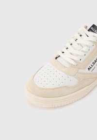 Άσπρο και μπεζ παπούτσι χαμηλού πάνω μέρους με μαύρη λεπτομέρεια στη φτέρνα, τρύπες στο μπροστινό μέρος, κλείσιμο με κορδόνια και τη σήμανση "ALLSAINTS" στο πλάι.