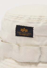 Ελαφρώς μπεζ βαμβακερό καπέλο τύπου μπάκετ με ραμμένη γείσο και μαύρη ετικέτα με την ένδειξη "Alpha Industries" στο μπροστινό μέρος.
