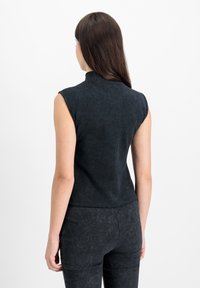 Γυναίκα με μακριά σκουρόχρωμα μαλλιά που φοράει αμάνικη μαύρη μπλούζα με ψηλό γιακά και λεπτομέρεια κοψίματος πάνω από το στήθος.
