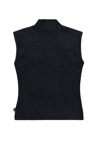 Μαύρο κοντό γιλέκο με φερμουάρ, χωρίς μανίκια, αντίθετες λευκές ραφές και ψηλό γιακά, συνδυασμένο με σκούρα τζιν.