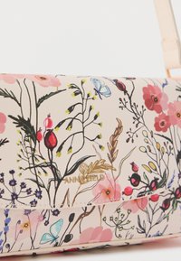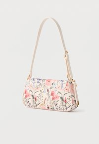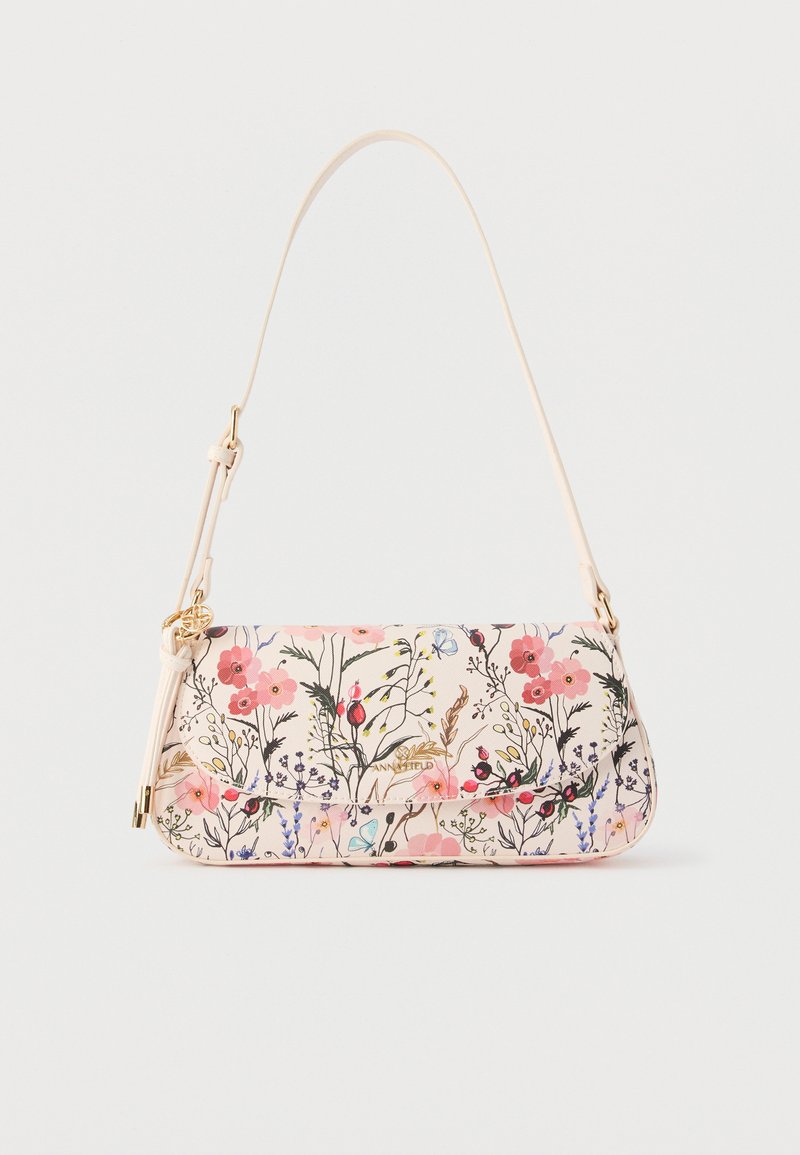 Μικρή μπεζ τσάντα ώμου με ροζ και μωβ λουλουδάτο σχέδιο, χρυσό εξάρτημα και ρυθμιζόμενο ιμάντα, σε απλό λευκό φόντο.