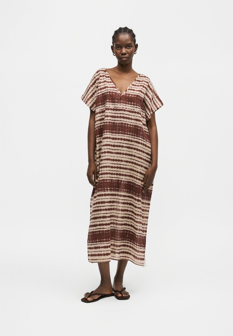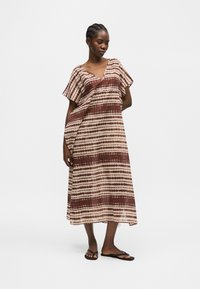 Γυναίκα που φοράει ένα καφέ και μπεζ ριγέ, χαλαρό midi φόρεμα με V-λαιμόκοψη, κοντά μανίκια και μαύρα σαγιονάρες, στέκεται μπροστά σε λευκό φόντο.