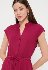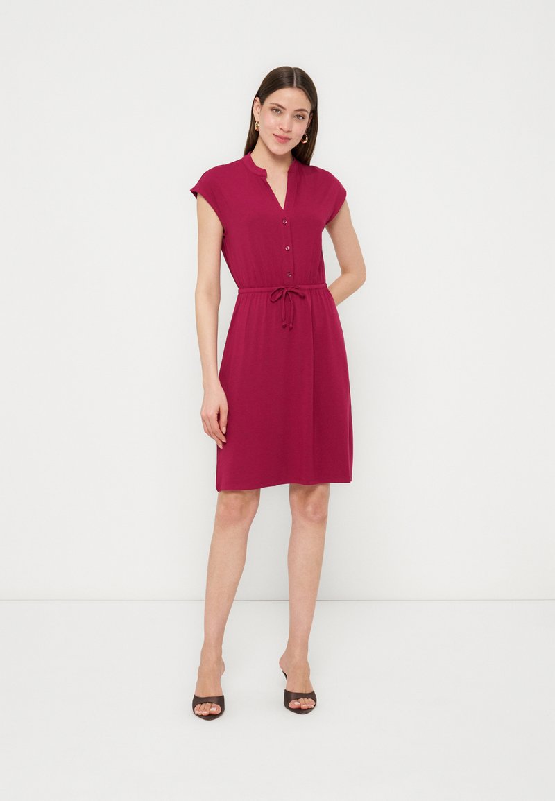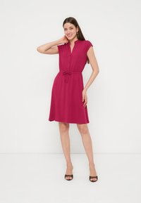 Γυναίκα που στέκεται μπροστά σε άσπρο φόντο, φοράει ματζέντα φόρεμα με κοντά μανίκια και μήκος έως το γόνατο, με κουμπιά και δετή ζώνη στη μέση, και μαύρες ψηλοτάκουνες ανοιχτές μύτες.