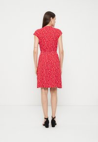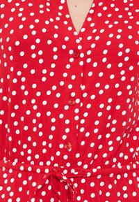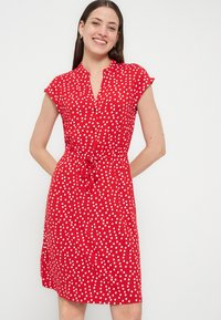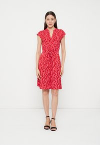 Γυναίκα που στέκεται και κοιτάζει μπροστά, φοράει κόκκινο φόρεμα μέχρι τα γόνατα με λευκές πουά και μαύρες γόβες με λουράκι στον αστράγαλο, μπροστά σε λευκό φόντο.