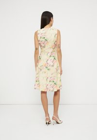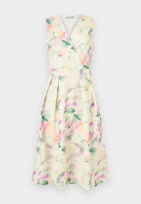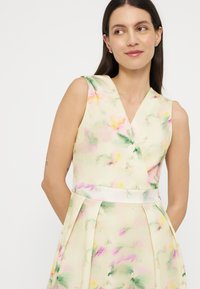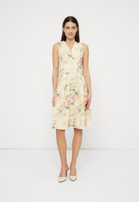 Γυναίκα με μακριά σκούρα μαλλιά, ντυμένη με μαν sleeveless παστέλ φλοράλ φόρεμα μέχρι το γόνατο και μπεζ τακούνια, στέκεται μπροστά σε λευκό φόντο.