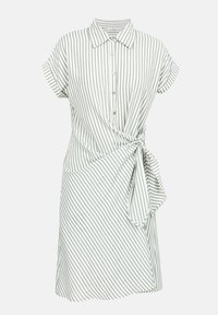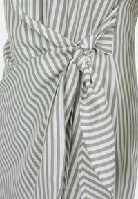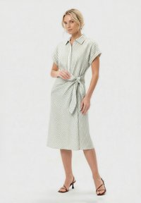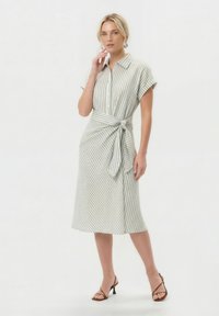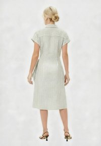Γυναίκα φοράει ένα μίντι φόρεμα με κάθετες ριγέ σε ανοιχτό γκρι και λευκό χρώμα, με κοντά μανίκια, γιακά, κουμπιά μπροστά, ζώνη στη μέση και καφέ σανδάλια με τακούνι.