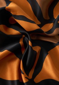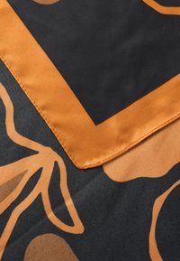 Τετράγωνο φουλάρι με μαύρο φόντο που παρουσιάζει μεγάλα, αφηρημένα πορτοκαλί και καφέ λουλουδένια σχήματα και πορτοκαλί περίγραμμα.