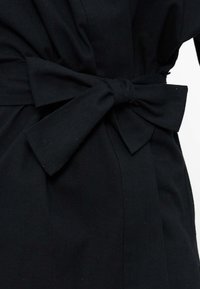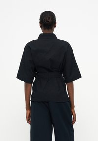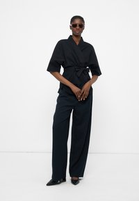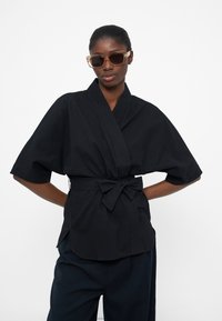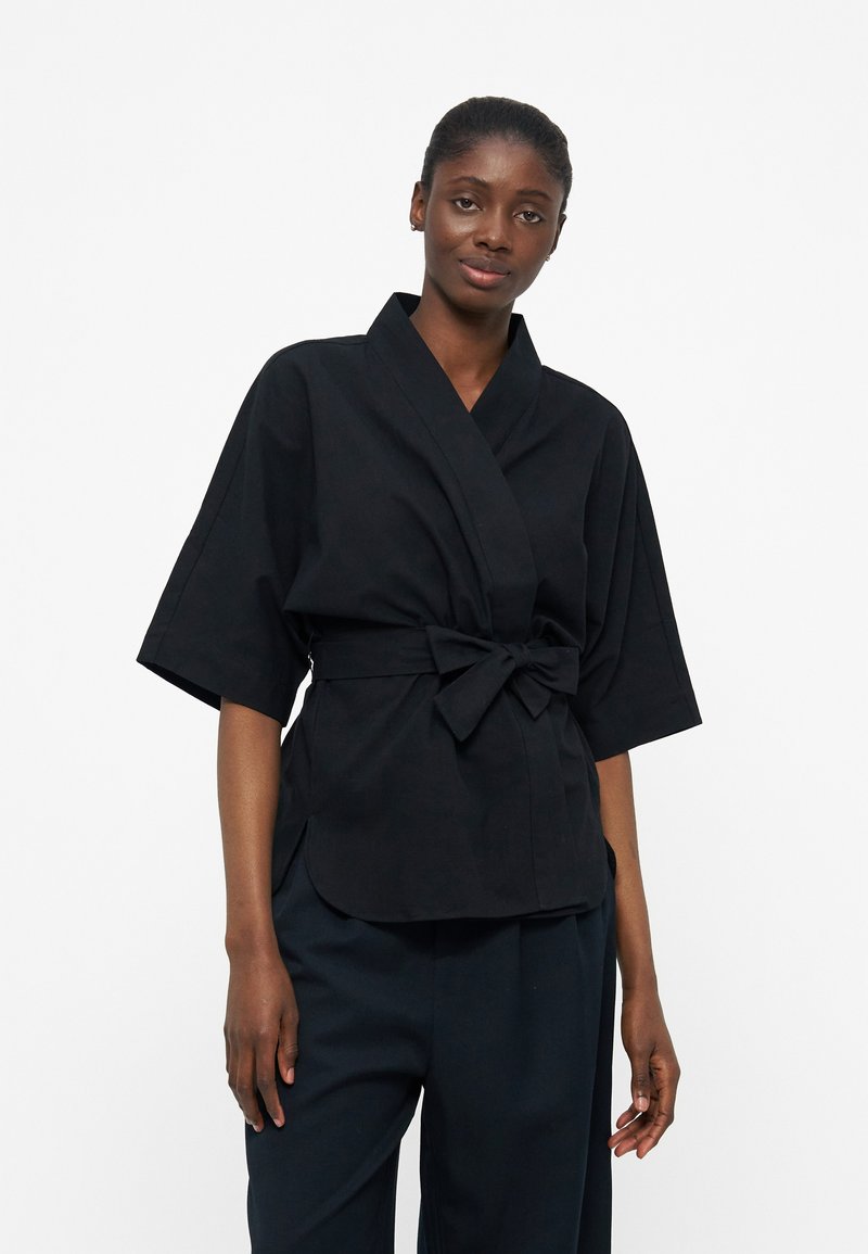 Γυναίκα που φοράει μαύρο τοπ τύπου wrap με φαρδιά μανίκια δεμένα στη μέση, σε συνδυασμό με σκούρο παντελόνι, όρθια μπροστά σε λευκό φόντο.