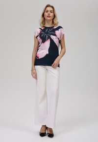 Ξανθιά γυναίκα που φοράει μαύρο και ροζ αμάνικο τοπ με αφηρημένο floral σχέδιο και λευκό παντελόνι, στέκεται μπροστά σε απλό φόντο.