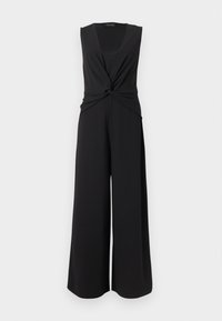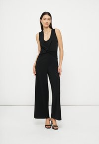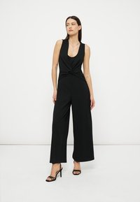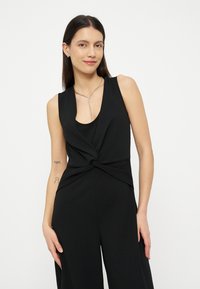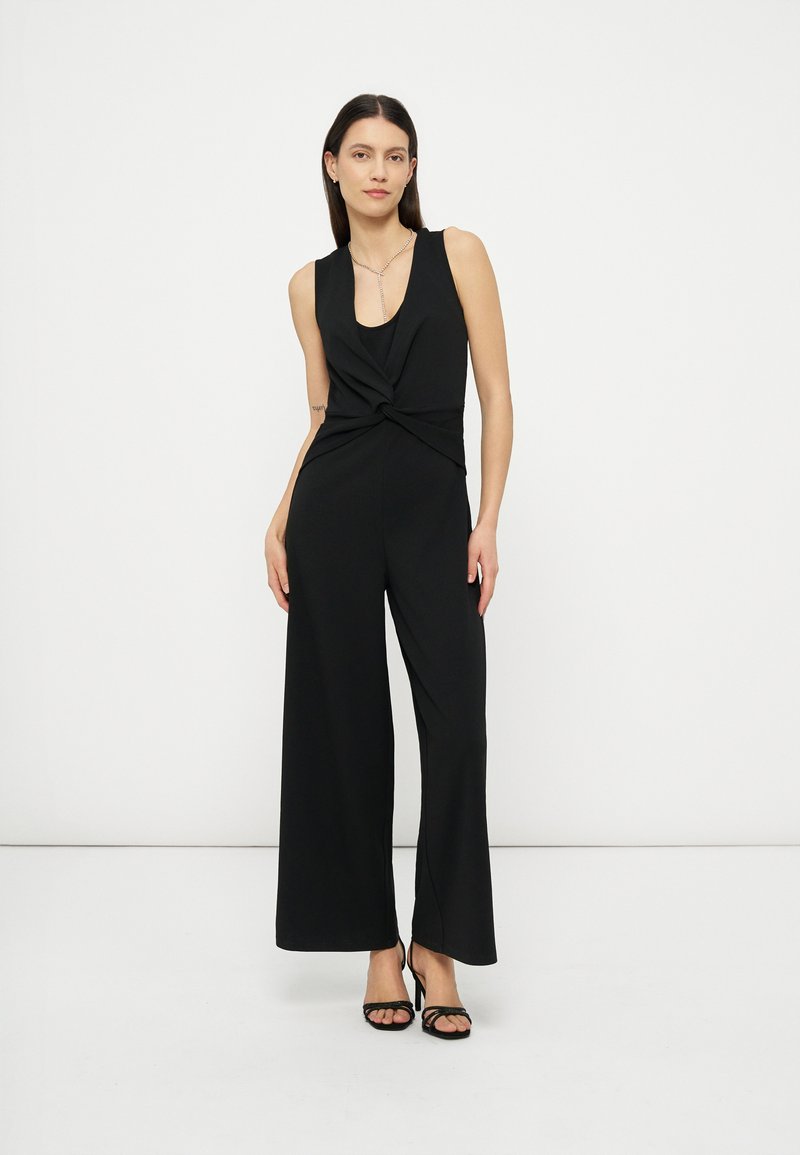 Γυναίκα που στέκεται, φορώντας μαύρη ολόσωμη φόρμα χωρίς μανίκια, με λεπτομέρεια δίπλωσης μπροστά και φαρδιά πόδια, συνδυασμένη με μαύρα σανδάλια με τακούνι και κολιέ.