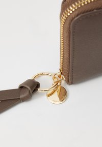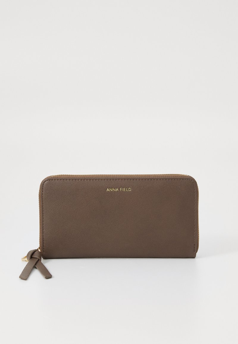 Καφέ πορτοφόλι από βίγκαν δέρμα με χρυσό λογότυπο, κλείσιμο με φερμουάρ και διακοσμητικό φούντα. Λεία υφή και ορθογώνιο σχήμα.