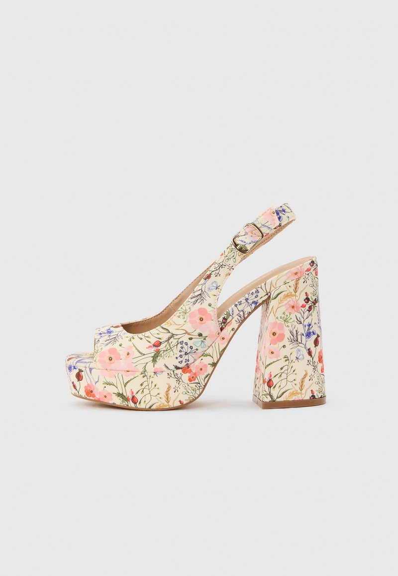 Πλατφόρμα πέδιλο με ψηλό τακούνι, ιμάντα στον αστράγαλο και αγκράφα, διακοσμημένο με άνθη σε ροζ, μωβ και πράσινες βοτανικές σχεδιαστικές λεπτομέρειες σε κρεμ φόντο.