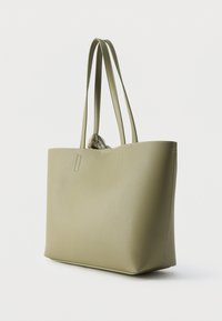 Τσάντα ώμου σε ελιά πράσινο με διπλές λαβές και φουλάρι με λουλουδάτο σχέδιο δεμένο σε μία λαβή.