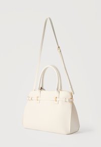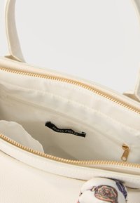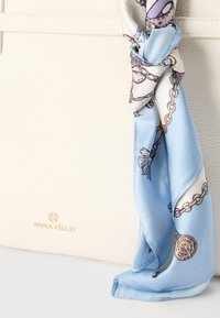 Λευκός δομημένος χειροποίητος τσάντα με λαβές στην κορυφή, ρυθμιζόμενο ιμάντα ώμου και μπλε φουλάρι με σχέδια δεμένο σε μία από τις λαβές.