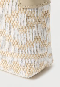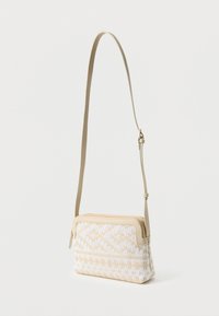 Μικρή μπεζ και λευκή πλεκτή τσάντα ώμου με γεωμετρικά σχέδια, δερμάτινη επένδυση, μπροστινή λουρίδα με αγκράφα σε χρυσό τόνο και ρυθμιζόμενο ιμάντα ώμου.