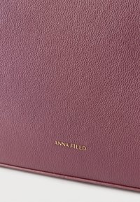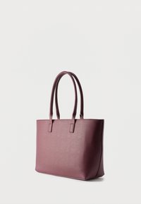 Σκούρο μοβ δερμάτινη τσάντα τύπου tote με δύο λαβές και μικρό χρυσό λογότυπο μάρκας στο μπροστινό μέρος, σε απλό ανοιχτό φόντο.