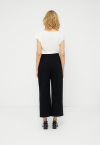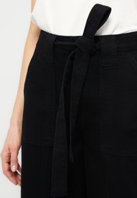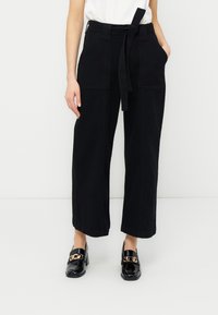 Γυναίκα που φοράει μαύρο παντελόνι με φαρδιά μπατζάκια, μπροστινές τσέπες και δεμένη ζώνη, συνδυασμένο με μαύρα παπούτσια λουστρίνι με χρυσή αλυσίδα.