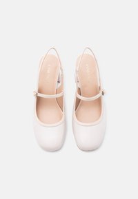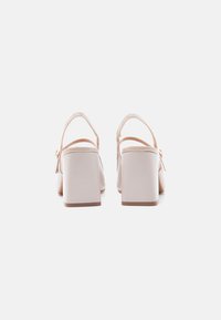 Γυναικείο παπούτσι slingback σε κρεμ απόχρωση με τακούνι τύπου block και ρυθμιζόμενο λουράκι με χρυσαφί αγκράφα, πλάγια όψη σε λευκό φόντο.