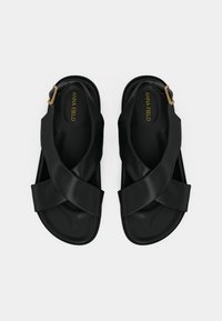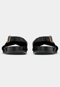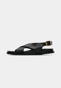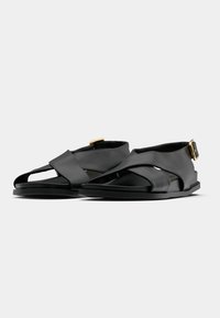 Μαύρο δερμάτινο σανδάλι με σχεδίαση σταυρωτού λουριού και λουρί πλάτης με χρυσή αγκράφα. Λείος υφής, επίπεδη σόλα, παρουσιάζεται πάνω σε ξύλινη επιφάνεια.