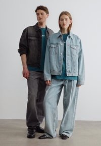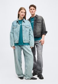 Άνδρας και γυναίκα φοράνε υπερμεγέθη πετρόλ μπλουζάκια· ο άνδρας στέκεται με την πλάτη προς τα πίσω δείχνοντας το λευκό λογότυπο στο πίσω μέρος, η γυναίκα κοιτάζει μπροστά με μικρό λογότυπο στο μπροστινό μέρος.