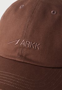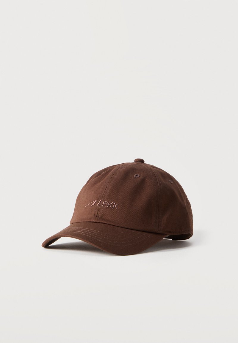 Καφέ καπέλο μπέιζμπολ με έξι πάνελ και καμπύλη γείσα, με κεντημένο λογότυπο "ARKK" στο εμπρός μέρος, παρουσιάζεται σε απλό ανοιχτό φόντο.