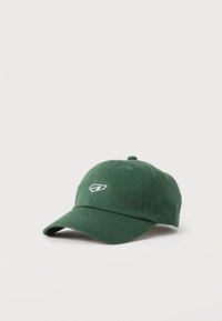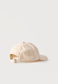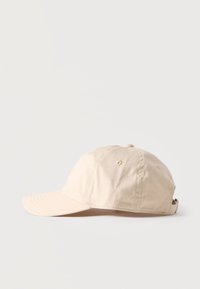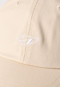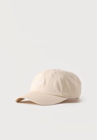 Μπεζ καπέλο του μπέιζμπολ με κυρτό γείσο και μικρό λευκό κεντημένο λογότυπο μπροστά, εμφανίζεται μπροστά σε απλό ανοιχτό φόντο.