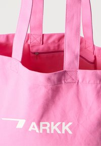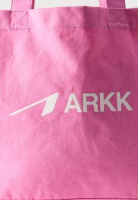 Ροζ υφασμάτινη τσάντα ώμου με δύο λαβές και λευκό λογότυπο "ARKK" στη μπροστινή όψη, πάνω σε ένα απλό ανοιχτό φόντο.